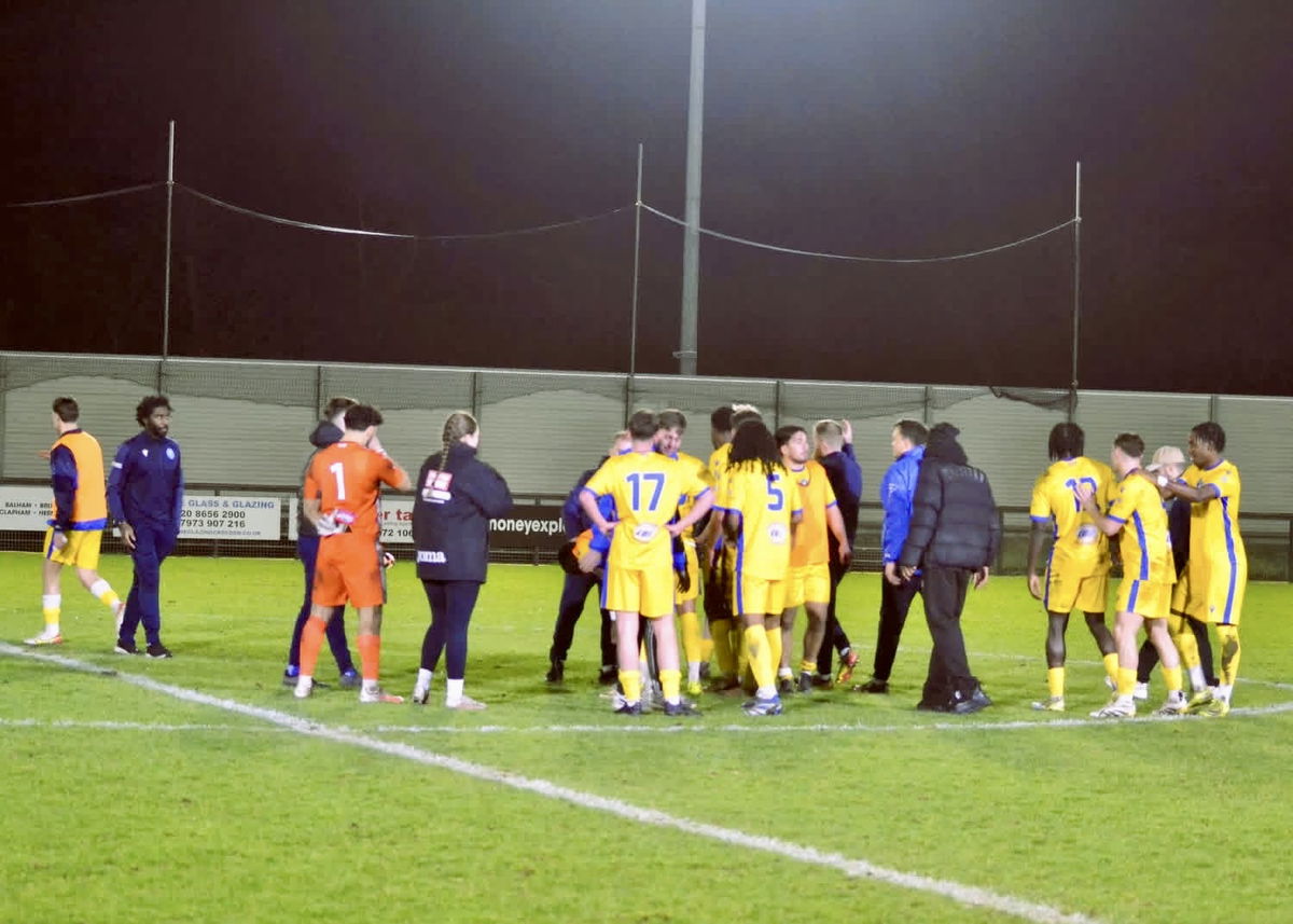 The game was mostly played in the Balham half, although they did come back into it during the five minutes before half-time. The referee “set his stall out” early by booking Luis Oliveira in the 8th minute. A further three yellow cards were brandished, making it 2–2 in the book at half-time.